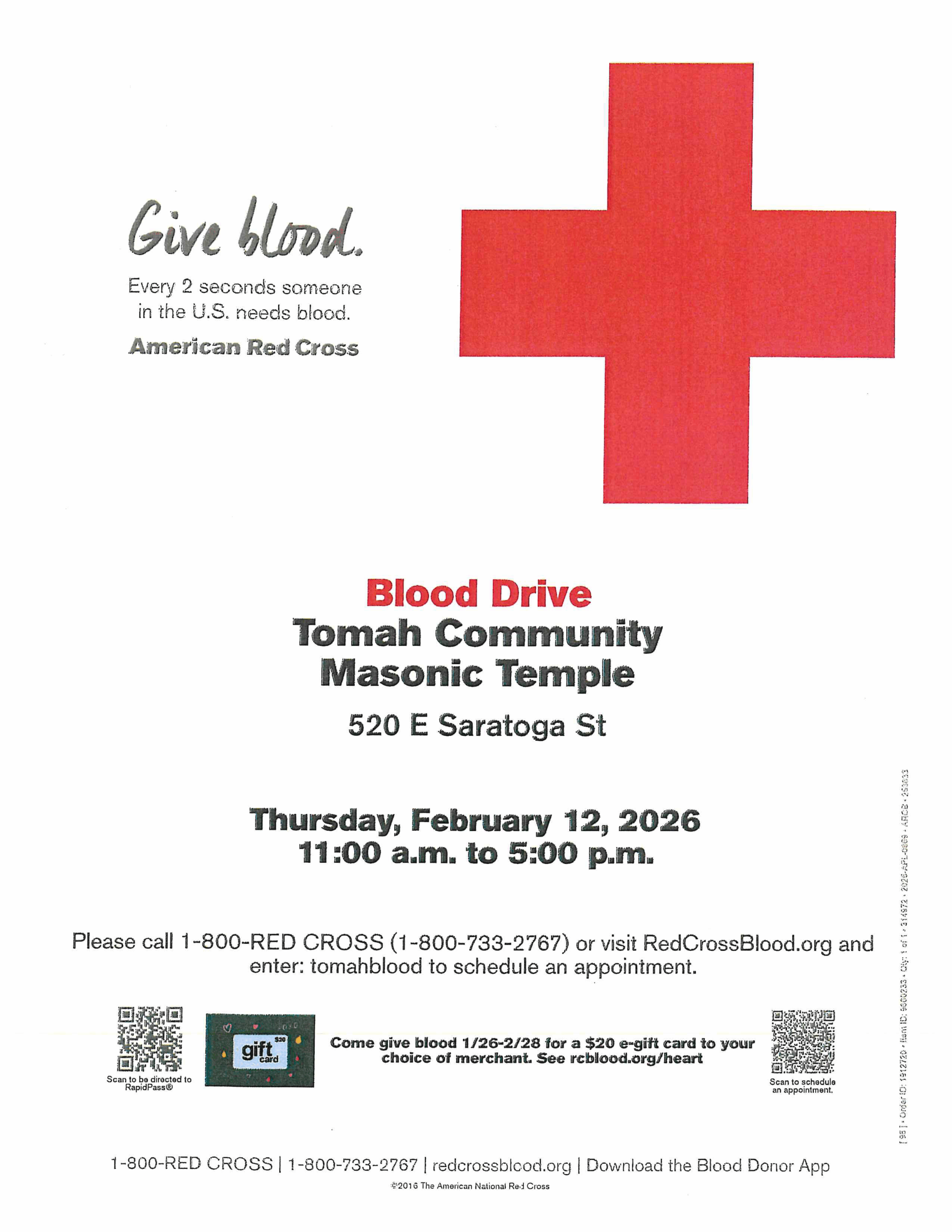 Please call 1-800-RED CROSS (1-800-733-2767) or visit RedCrossBlood.org and enter: tomahblood to schedule an appointment.