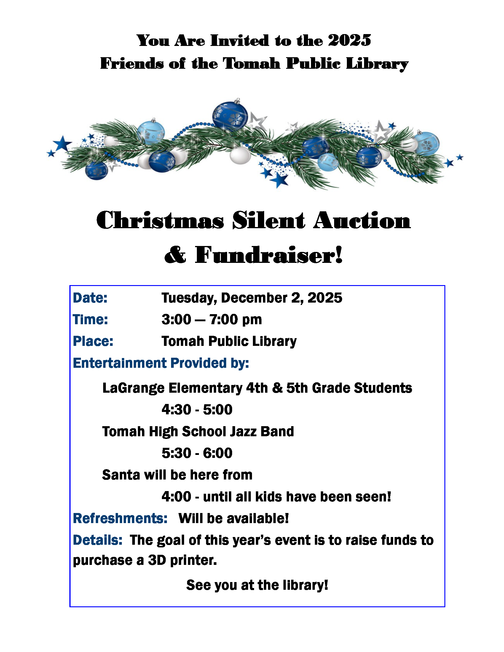 Join the Friends of the Tomah Public Library for their annual silent auction held at the Tomah Public Library on Tuesday, December 2, 2025, from 3:00pm to 7:00pm. Enjoy entertainment, refreshments, and a visit from Santa, in addition to the wide variety of auction items that will be available. Many items would make great Christmas gifts and are already wrapped!