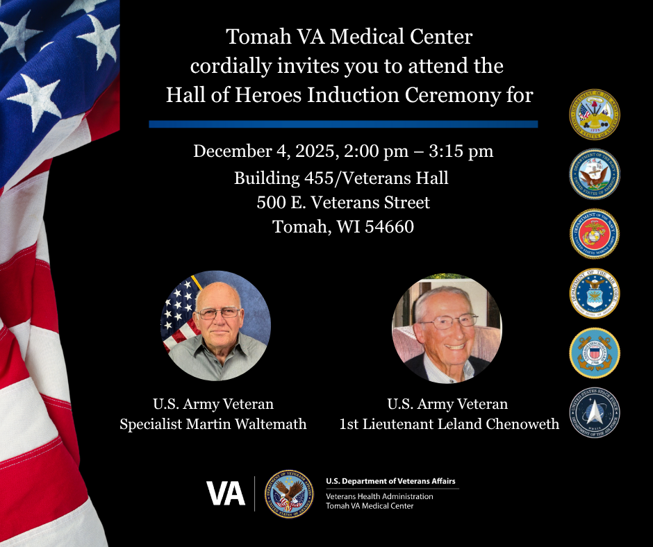 Tomah VA Medical Center cordially invites you to attend the Hall of Heroes Induction Ceremony for U.S. Army Veteran Specialist Martin Waltemath and U.S. Army Veteran 1st Lieutenant Leland Chenoweth.