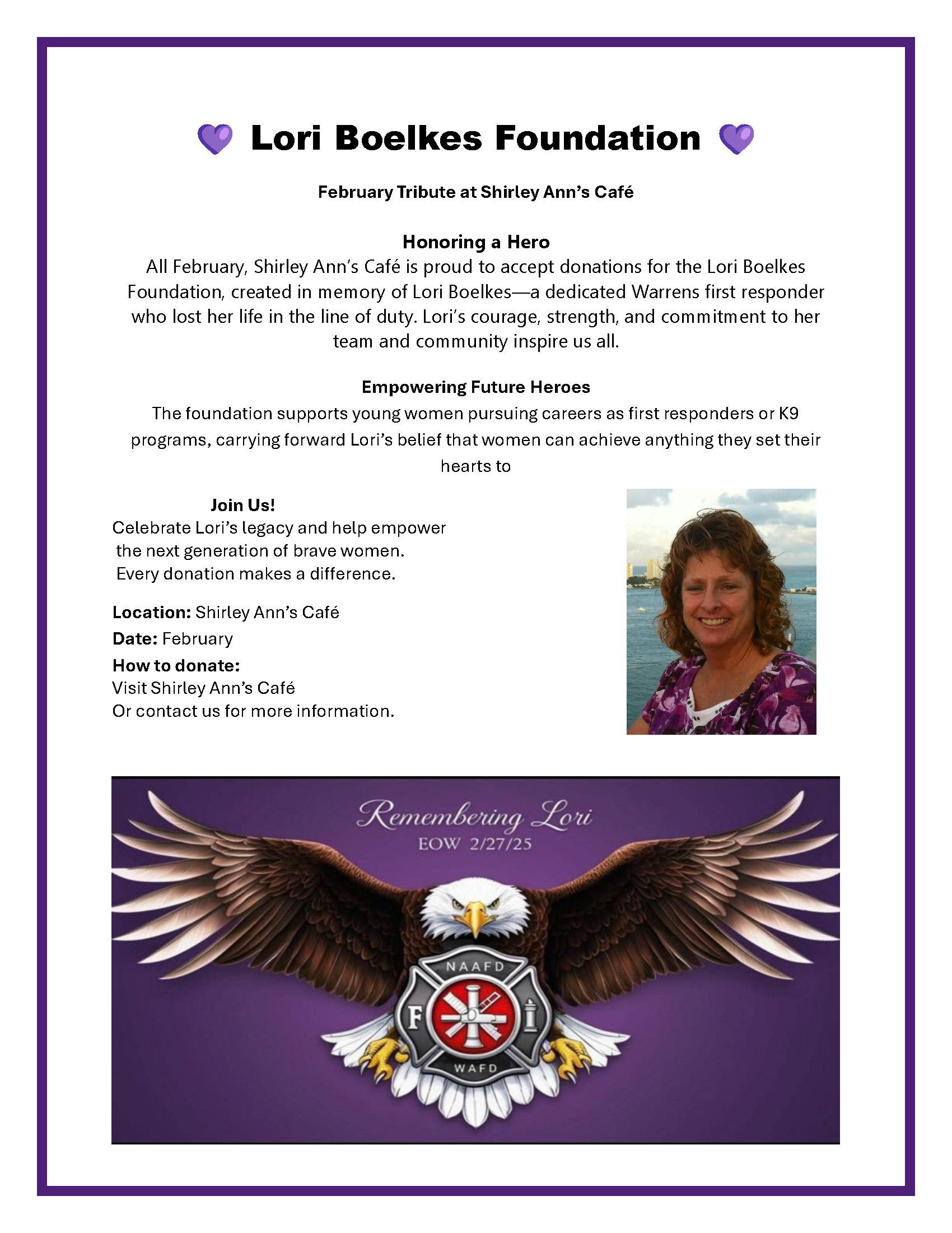 Throughout the month of February, Shirley Ann’s Café will host a special tribute in support of the Lori Boelkes Foundation, honoring the life and legacy of Lori Boelkes—a dedicated Warrens first responder who lost her life in the line of duty.