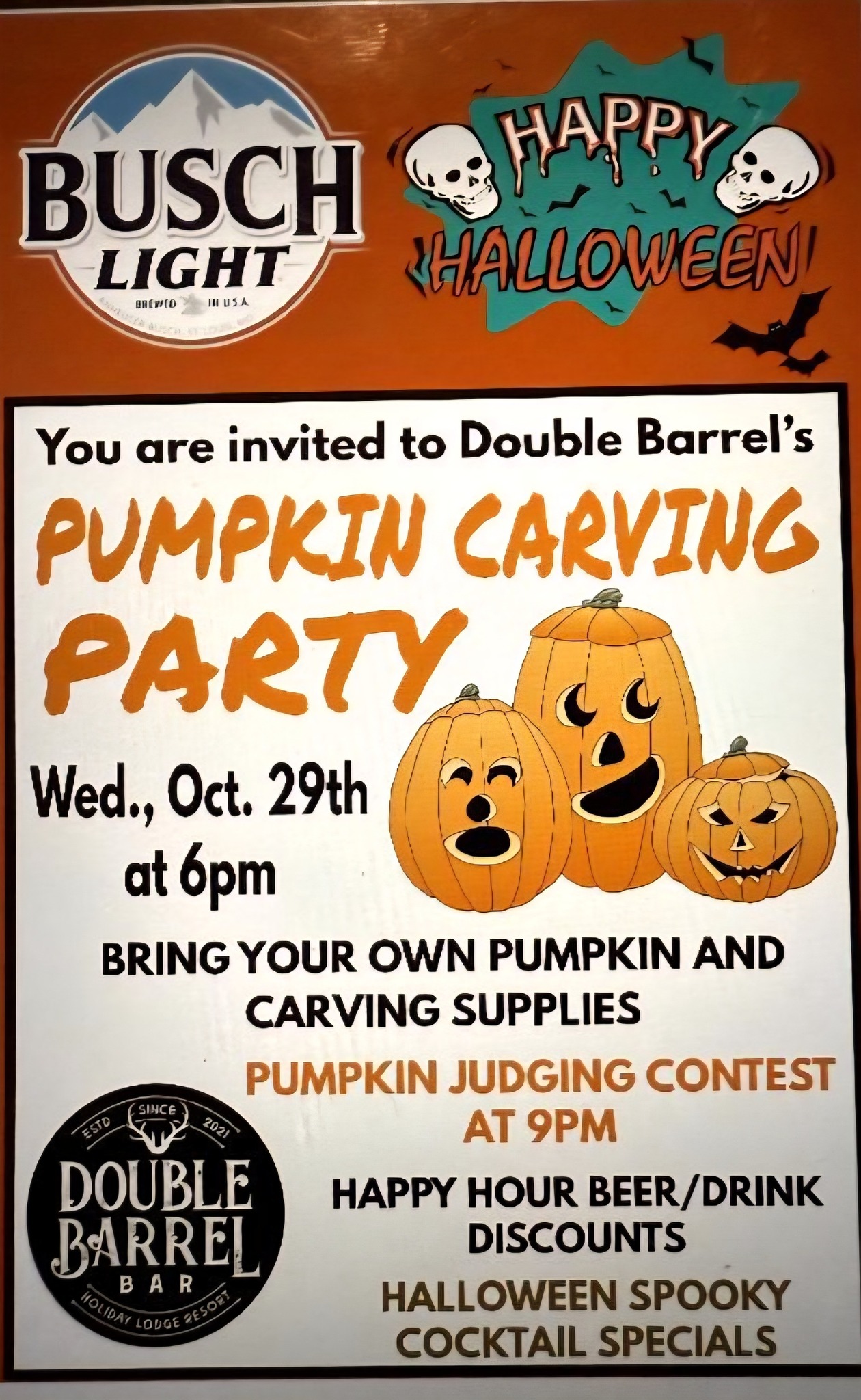 You’re invited to Double Barrel’s Pumpkin Carving Party! Bring your own pumpkin and carving supplies. Pumpkin judging contest at 9pm. Happy hour beer/drink discounts and Halloween spooky Coctail Specials.