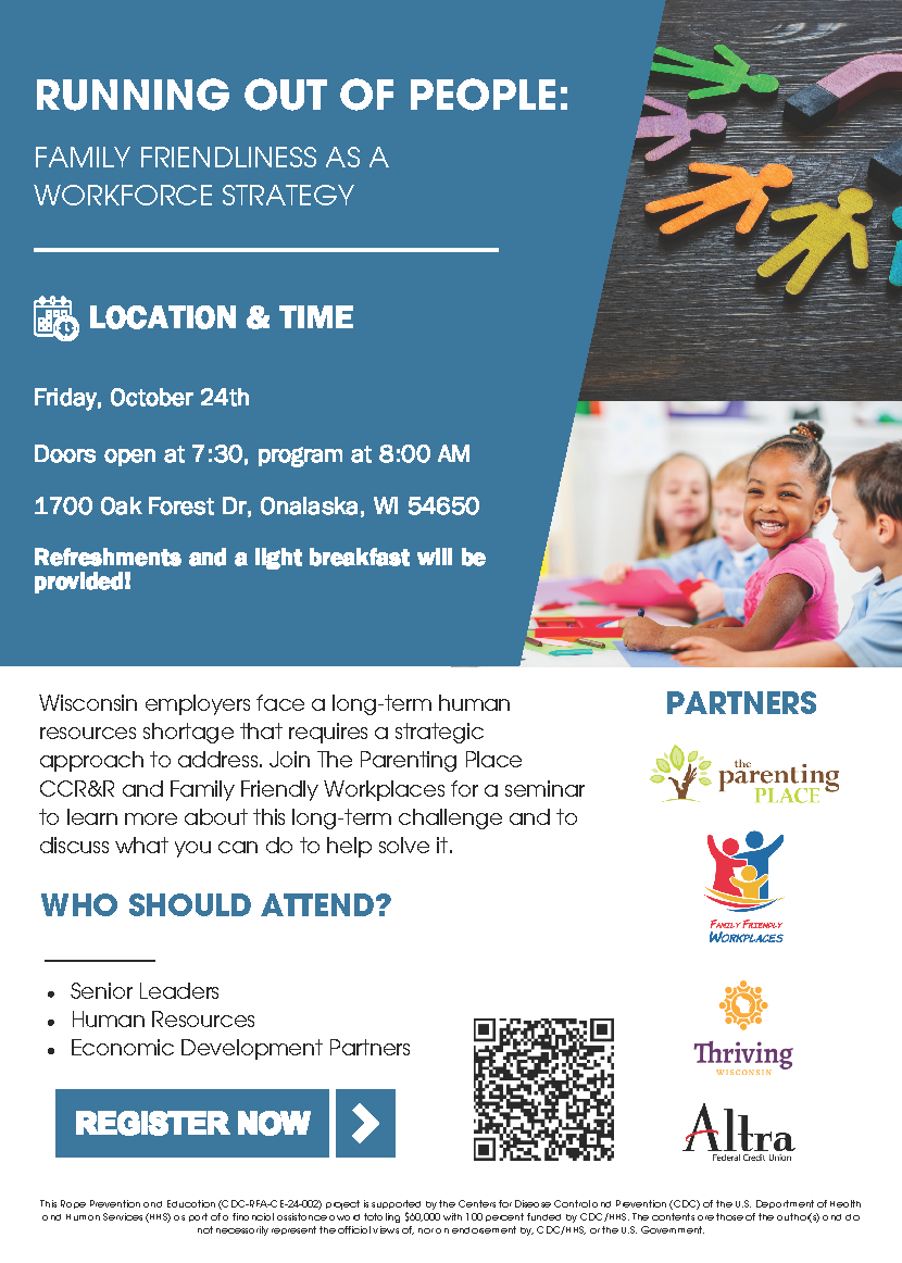 Wisconsin employers face a long-term human resources shortage that requires a strategic approach to address. Join The Parenting Place CCR&R and Family Friendly Workplaces for a seminar to learn more about this long-term challenge and to discuss what you can do to help solve it.
