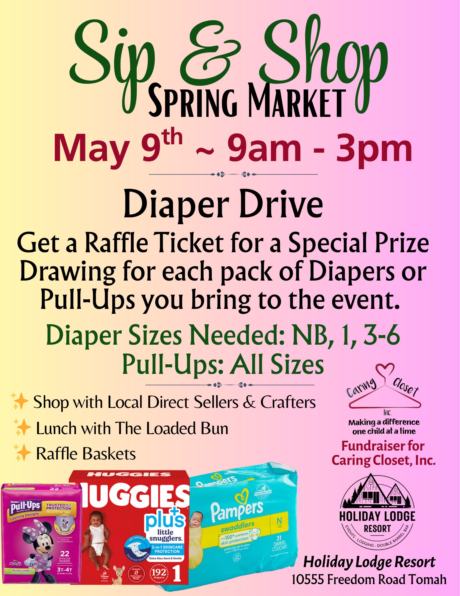 Join the community for a fun and meaningful day at the Sip & Shop Spring Market on May 9th from 9:00 AM to 3:00 PM at Holiday Lodge Resort – Double Barrel Bar in Tomah!