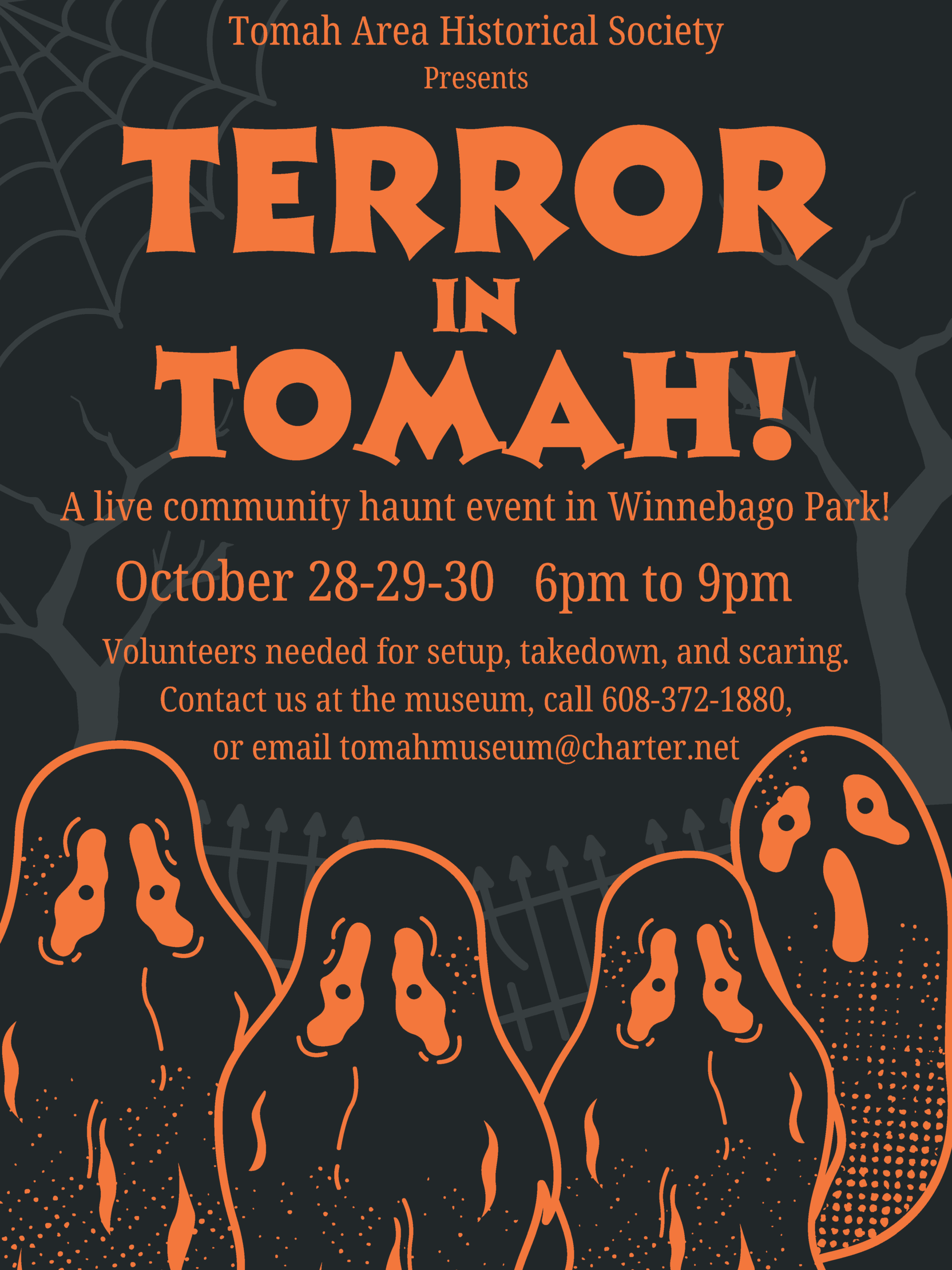 Volunteers needed for setup, takedown, and scaring; Contact the Tomah Museum, call 608-372-1880, email tomahmuseum@charter.net, or stop by the museum at 321 Superior Ave, Tomah.  Deadline to sign up is October 25, 2025.
