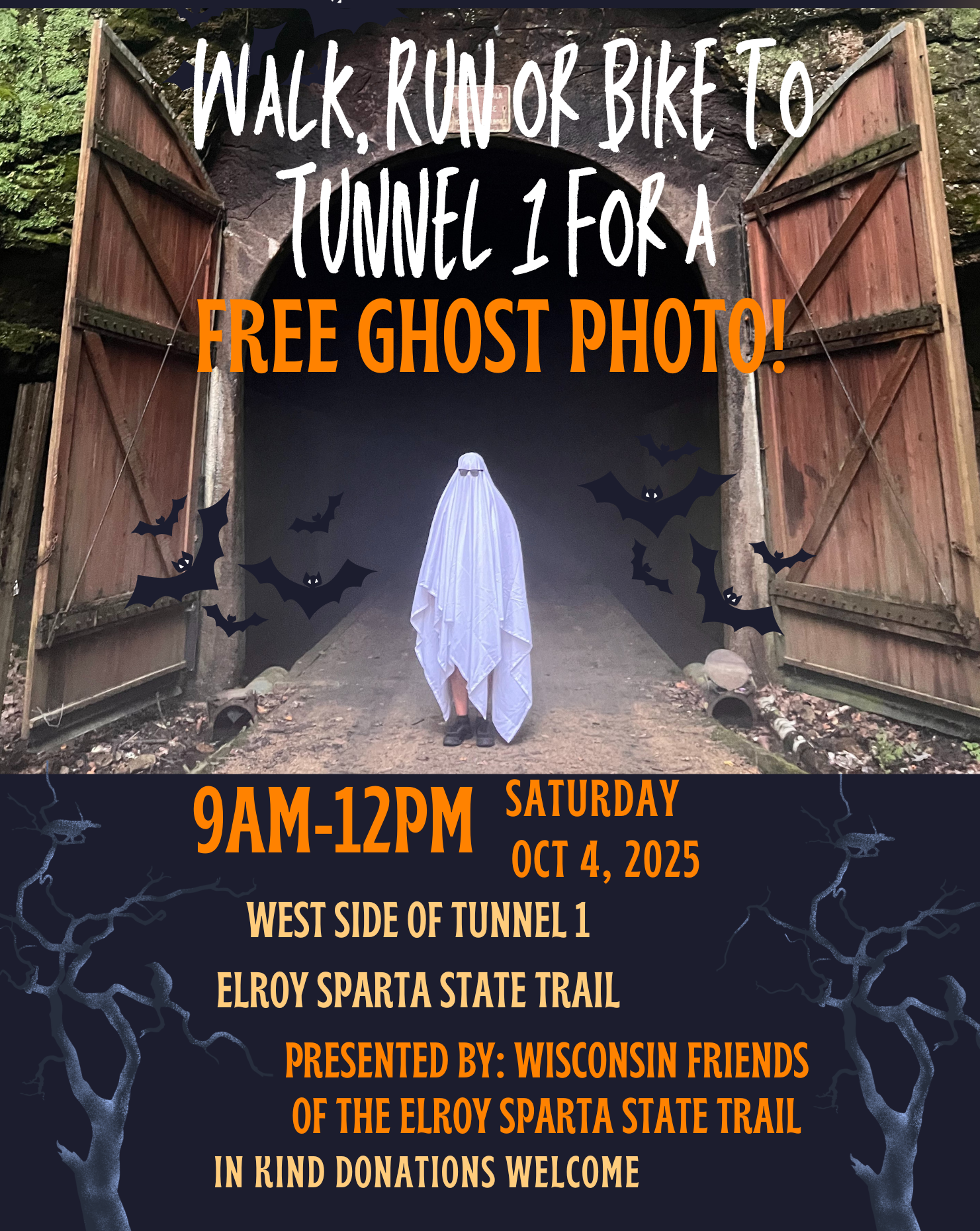 A free event sponsored by the Wisconsin Friends of the Elroy-Sparta Bike Trail. Walk, run, or bike to Tunnel #1 and have a free ghost photo taken in preparation for autumn and Halloween!